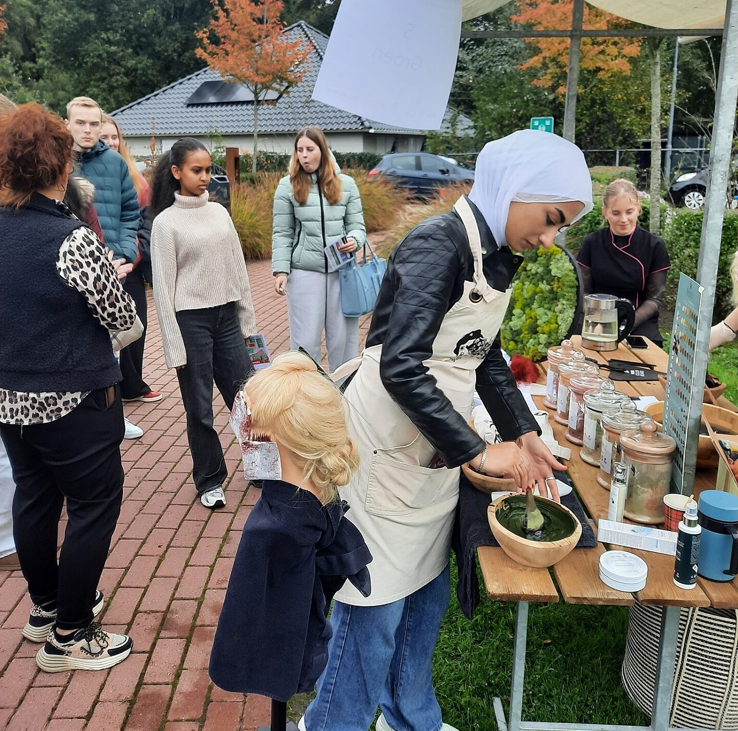 Niet alleen de techniekstudenten dachten mee. Ook studenten van andere opleidingen gaven duurzaamheid een plek in hun vak. Elvira, tweedejaars student van de kappersopleiding, stond bij de stand Groene Kappers